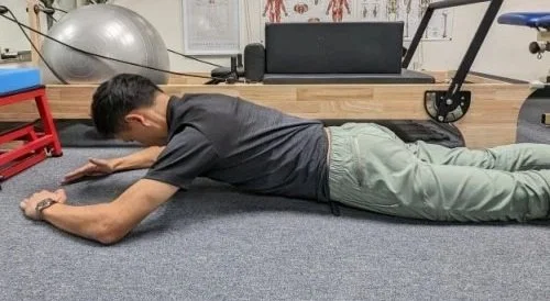 -DNS Prone 3-month position: Lie on stomach flat on the surface with forehead rested on a towel and bent elbows at about ear level. Breathe and stabilize into lower trunk (feel pubic symphysis bone and both inner elbows on surface). Keep shoulder blades "down and out" away from ears and away from spine. Externally rotate shoulders and you should feel inner elbows pushing into the surface. The chest and head are lifted off the surface. Keep spine straight especially the neck. The shoulder muscles should be activating to maintain neutral position. Make sure to keep gluts and hamstrings relaxed.