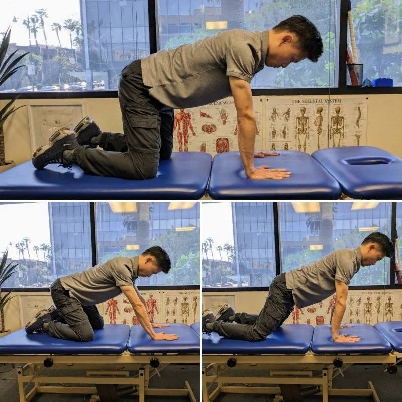 -DNS Quadruped neutral and rocking: Get into an all fours position with hands below shoulders and knees below hips. Keep spine straight — the neck should be aligned with rest of spine. The shoulder blades should be down away from ears and out away from spine – so it is flat across the upper back (no dip). Maintain stabilization in the lower trunk. Equal weight bearing throughout palms and rotate your upper arms/shoulders outwards, relax pecs. Rock back and forth maintaining above positions. (**A mirror could help you see your positioning better).