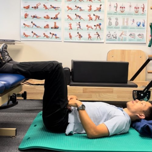 -DNS Supine 3-month position: Lying on back with feet up on chair, head supported. Place your fingers in 2 inches in from pelvic bone. Breathe in thru nose and initiate breath into area where fingers are. This area should rise before the chest rises. As you exhale, press outwards into your fingers as to maintain the pressure. Continue breathing while maintaining stabilization. Make sure upper abdominal area is relaxed. You should feel back of the head and both shoulder blades into the surface, as well as upper gluts (YouTube link here)